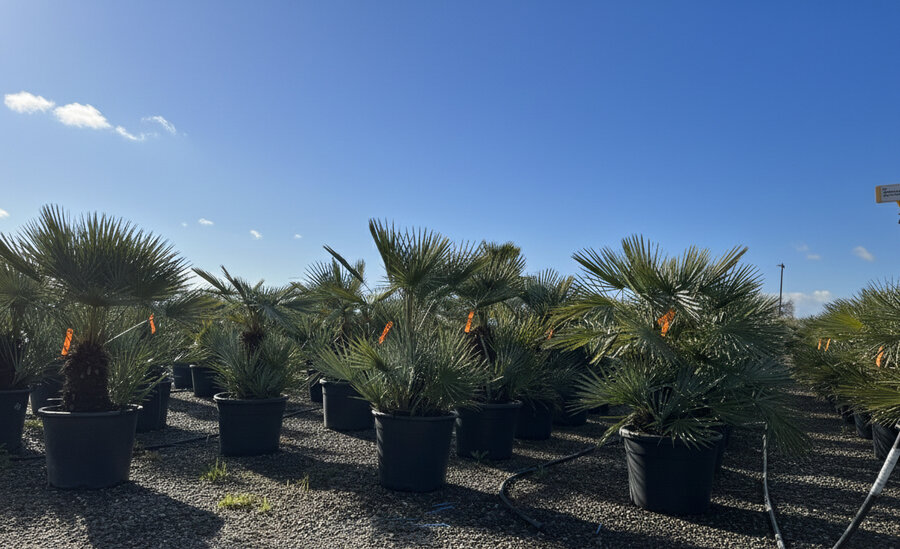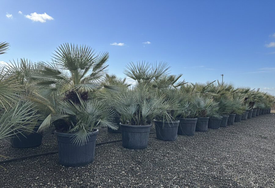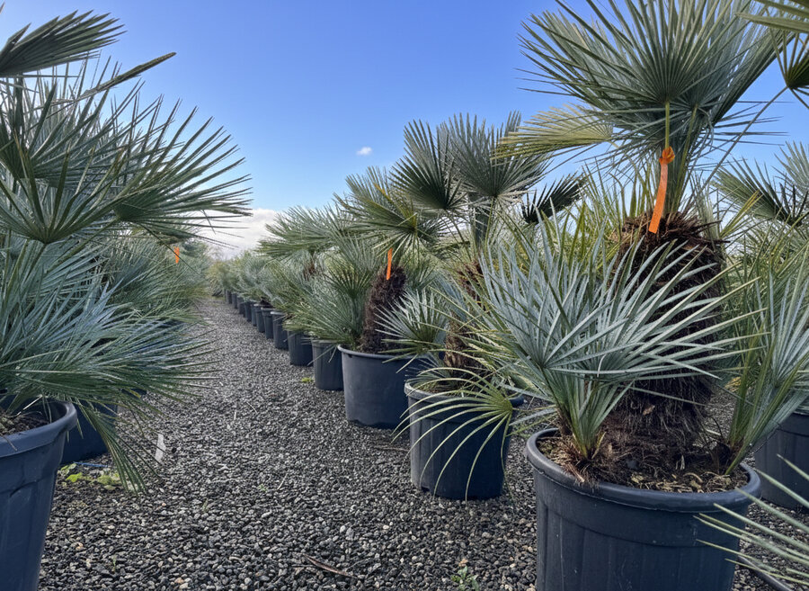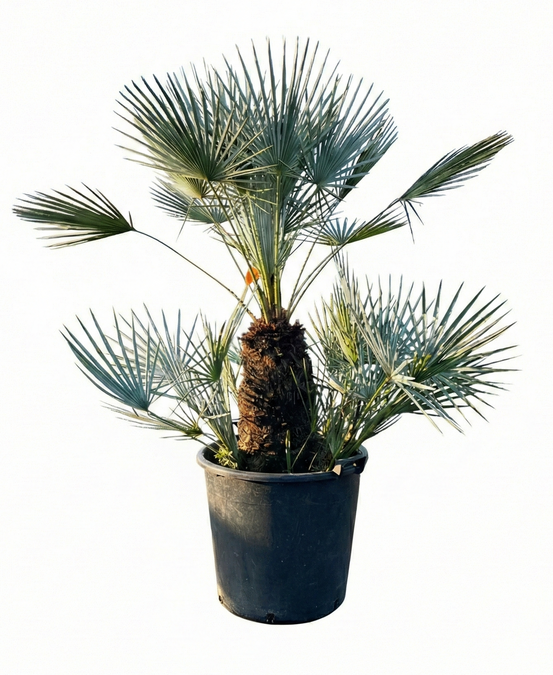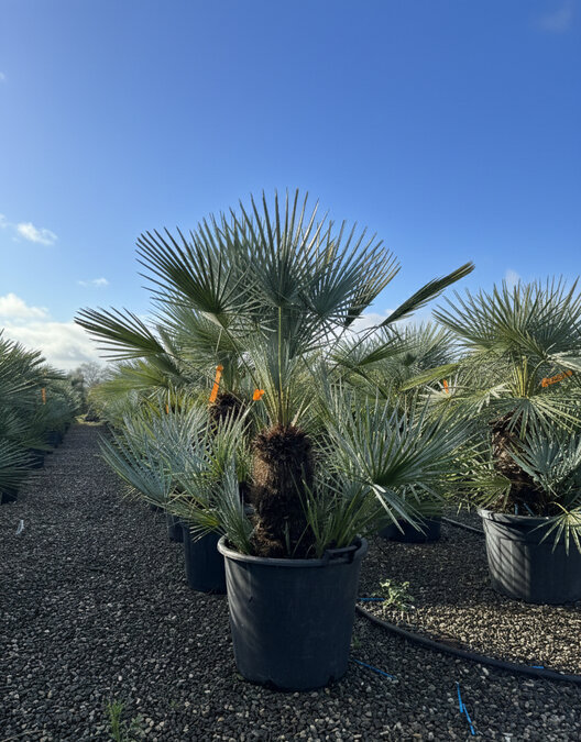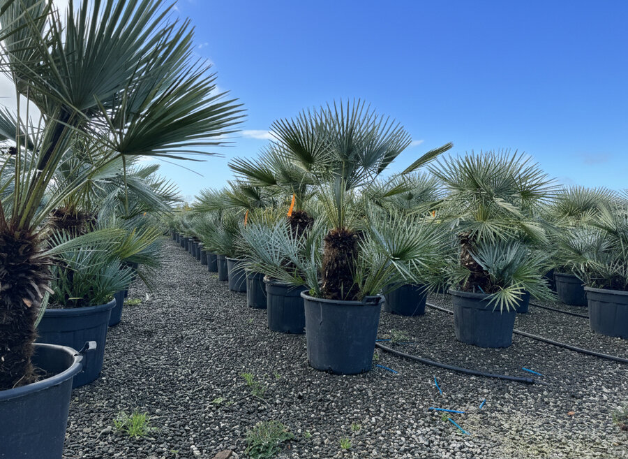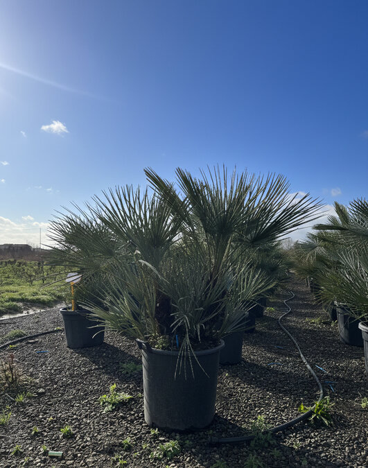 Met een totale hoogte van circa 150 cm inclusief 55L pot is deze palm een echte blikvanger. De stevige stammen en compacte groei maken hem geschikt voor zowel volle grond als een ruime sierpot.